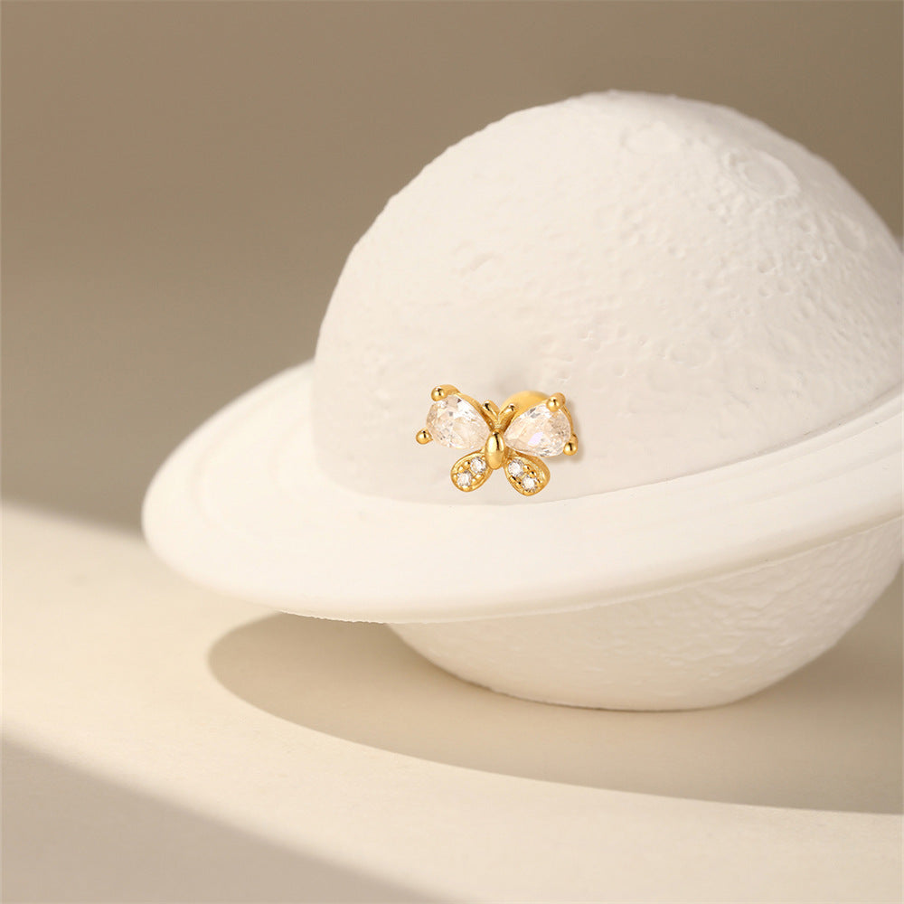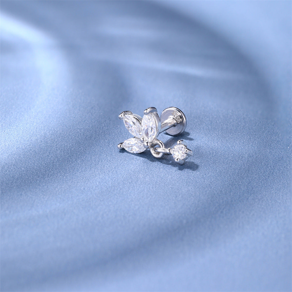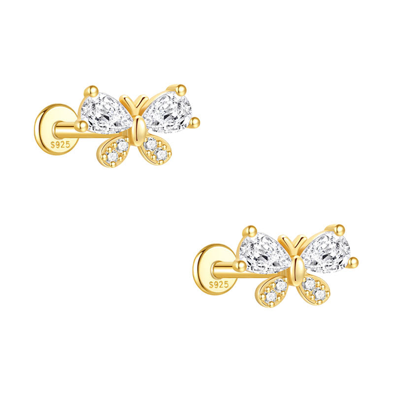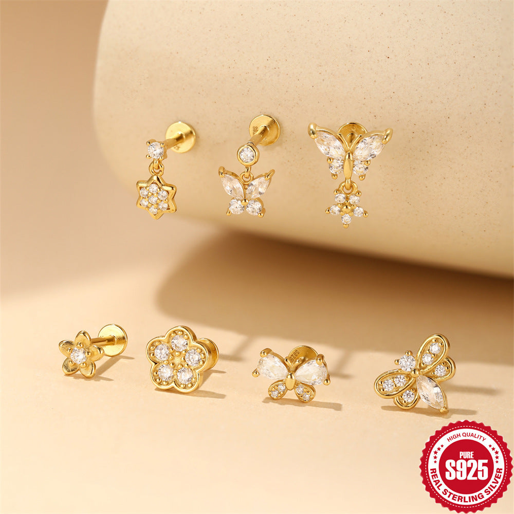 Butterfly & Zircon Flower Flat Back Earrings 925 Sterling Silver Gold Plated Cartilage Jewelry