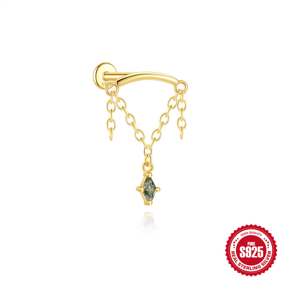 Unique Chain Accent Moss Agate Flat Back Earrings S925 Gold Plated Sterling Silver Delicate Cartilage Earring