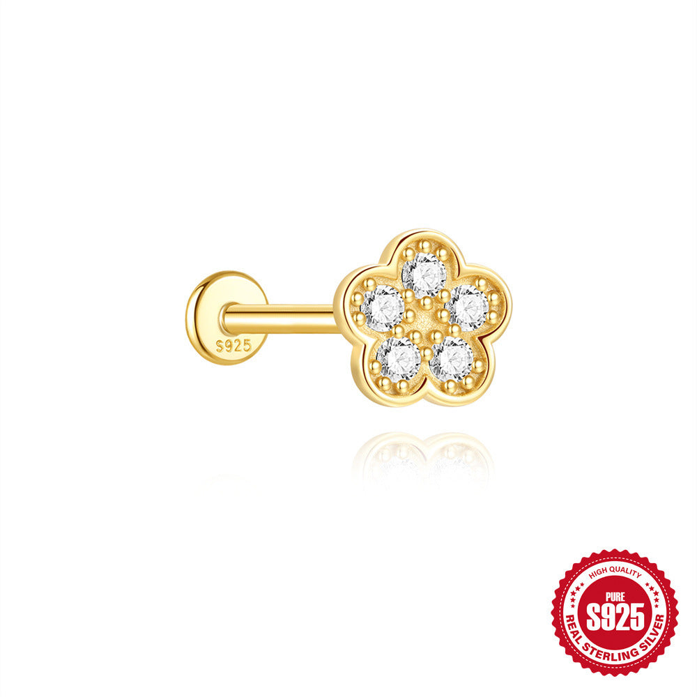 Gold Flower Flat Back Earrings 925 Silver Zircon Cartilage Piercing Earring