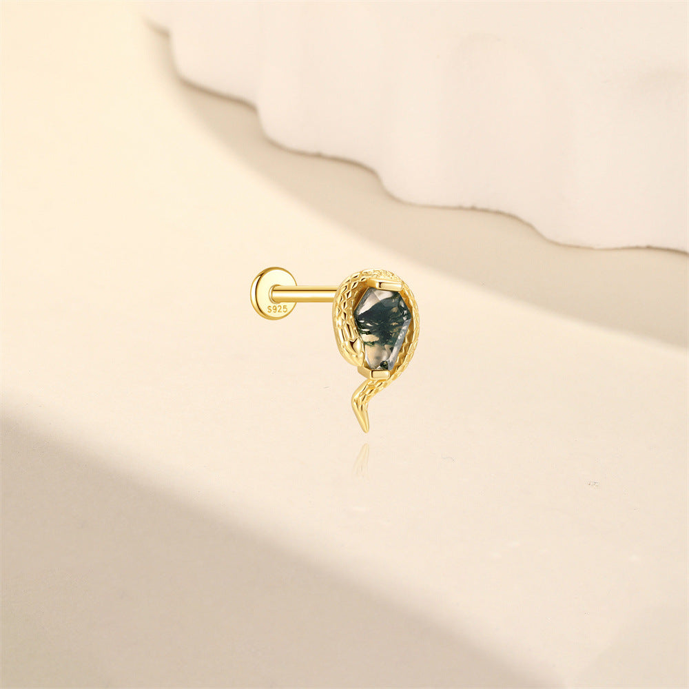 Unique Snake Shaped Moss Agate Flat Back Earrings S925 Sterling Silver Gold Plated Delicate Cartilage Jewelry