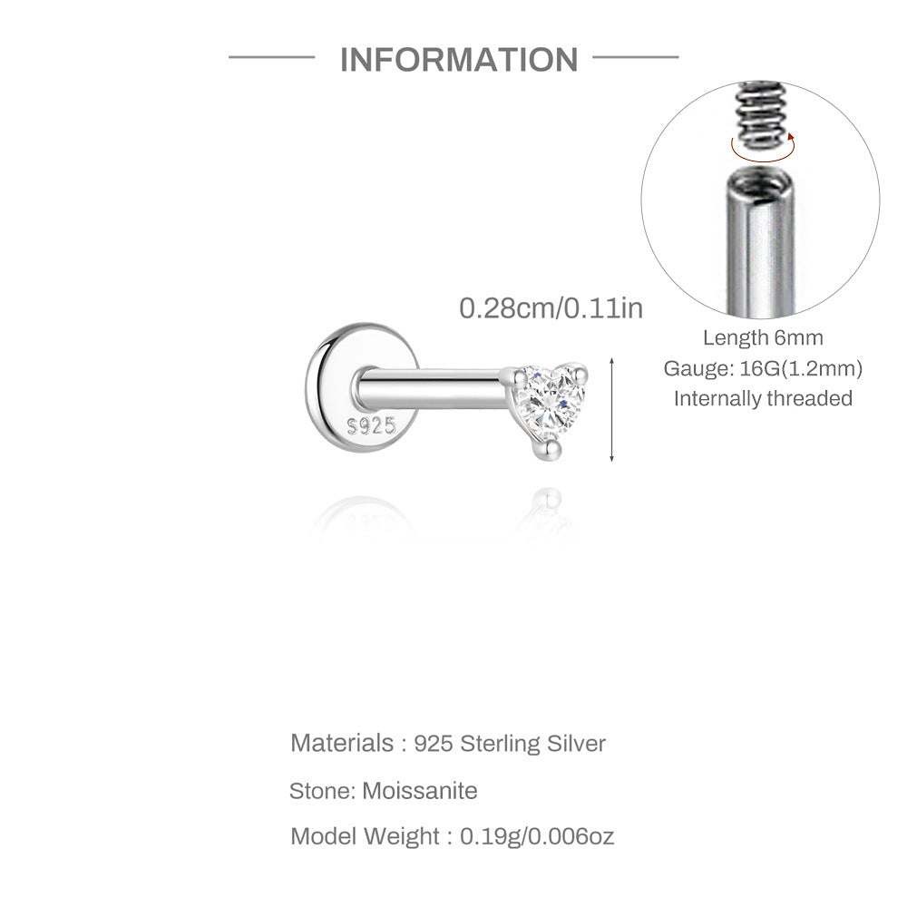Heart Shaped Moissanite Flat Back Earring S925 Sterling Silver Delicate Cartilage Jewelry
