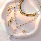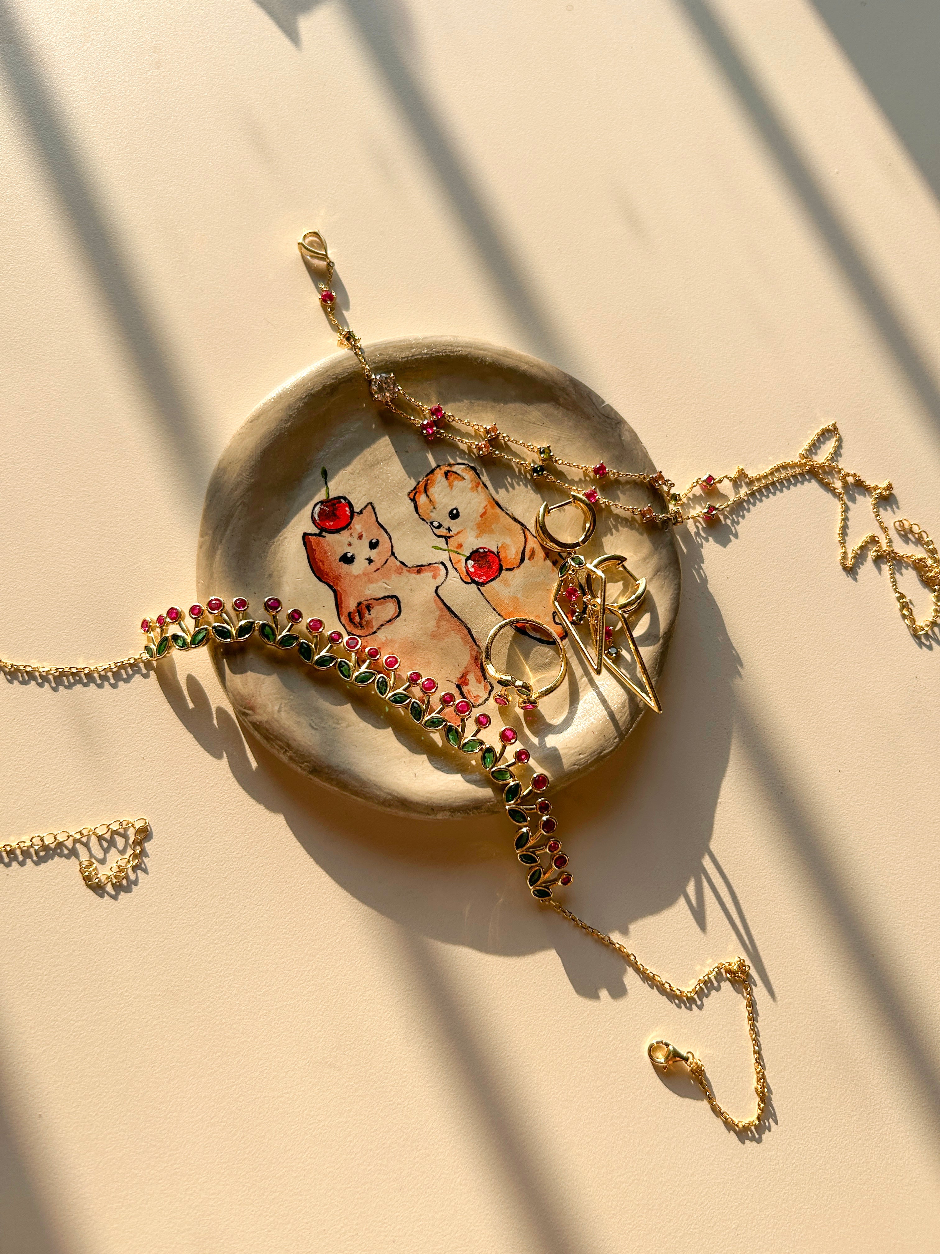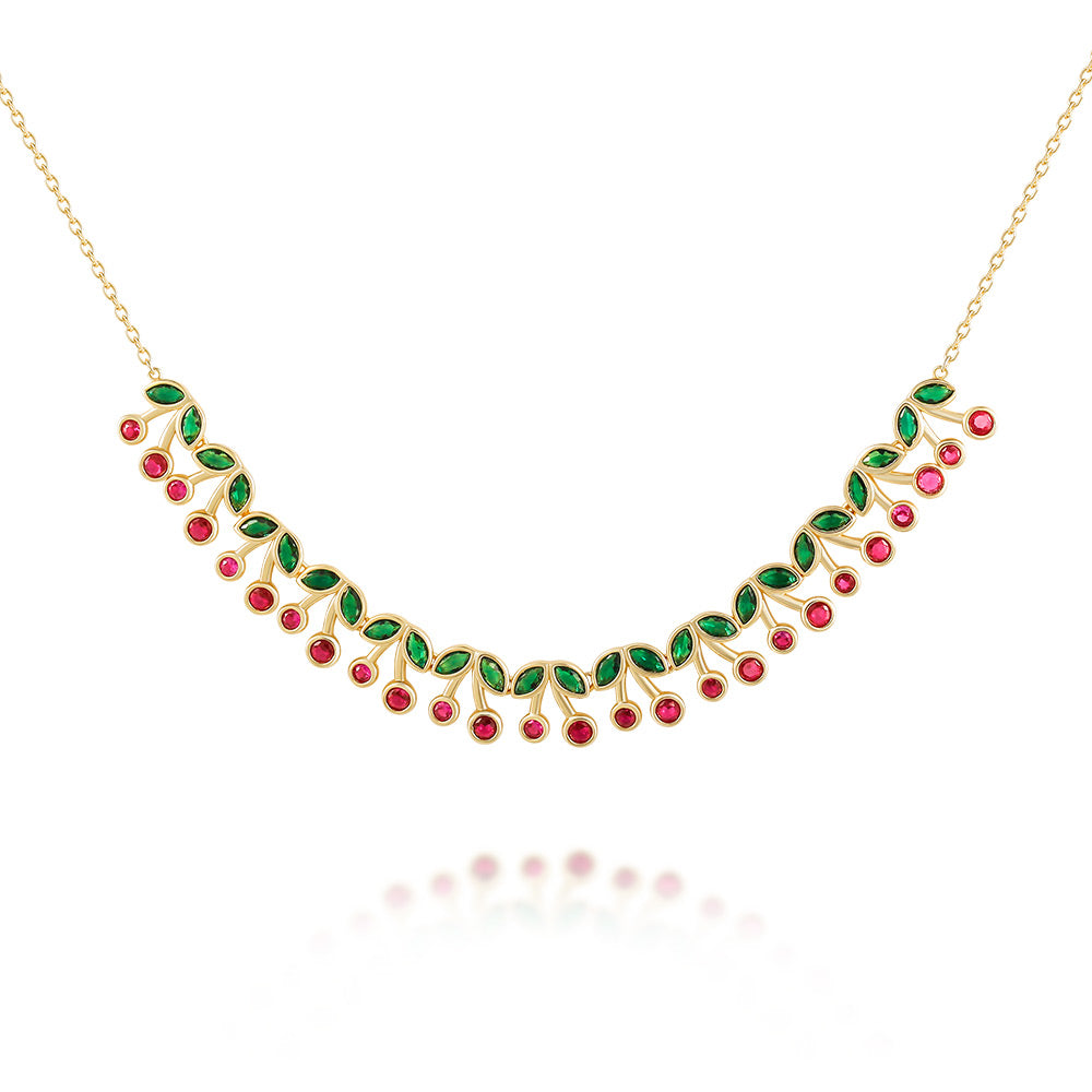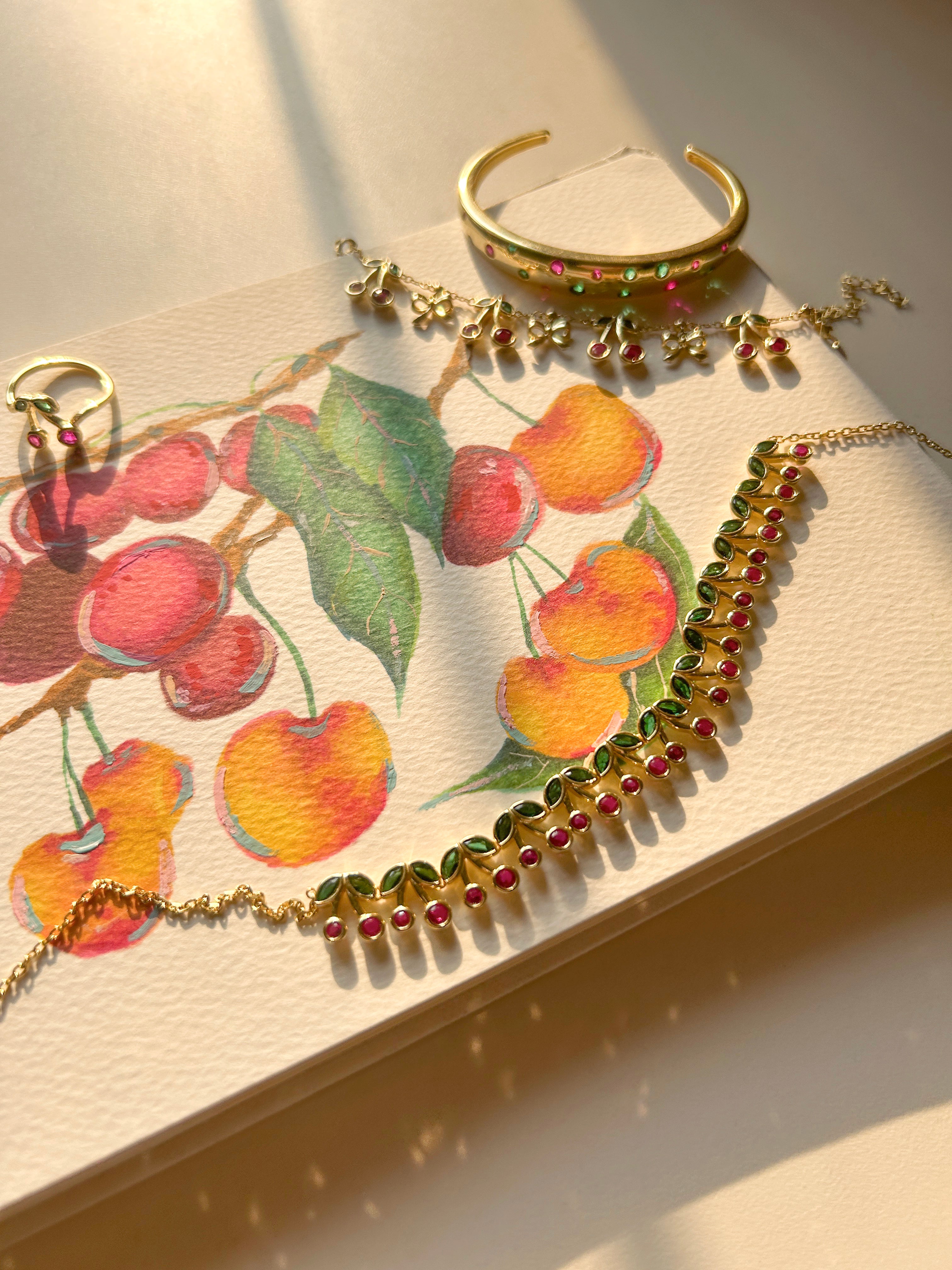A stunning necklace inspired by the natural beauty of ripe cherries, featuring delicate ruby-hued gemstones and glossy green leaf-shaped accents, paired with luxurious gold-plated details. Perfect for layering or wearing solo, it adds a playful yet sophisticated vibe to your outfit.